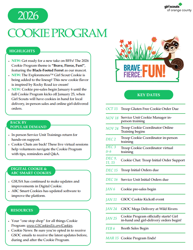 The 2026 Cookie Program theme is “Brave, Fierce, Fun!” and the Cookie program animal mascot is the Black Footed Ferret!